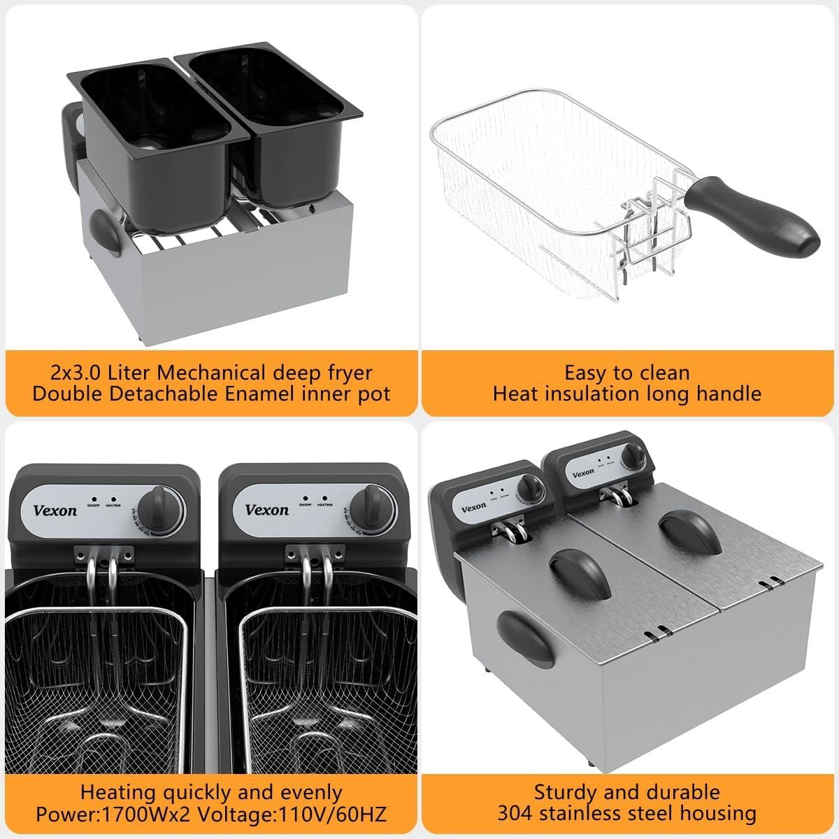 5.FASTER AND MORE EFFICIENT - Dual heads and power plugs for single large capacity tank applications. Each pan comes with a 3L capacity, making it ideal for both home and commercial use. Double fat fryers, electric deep fryers with basket, and small deep fryers with basket allow you to fry different foods at different temperatures!