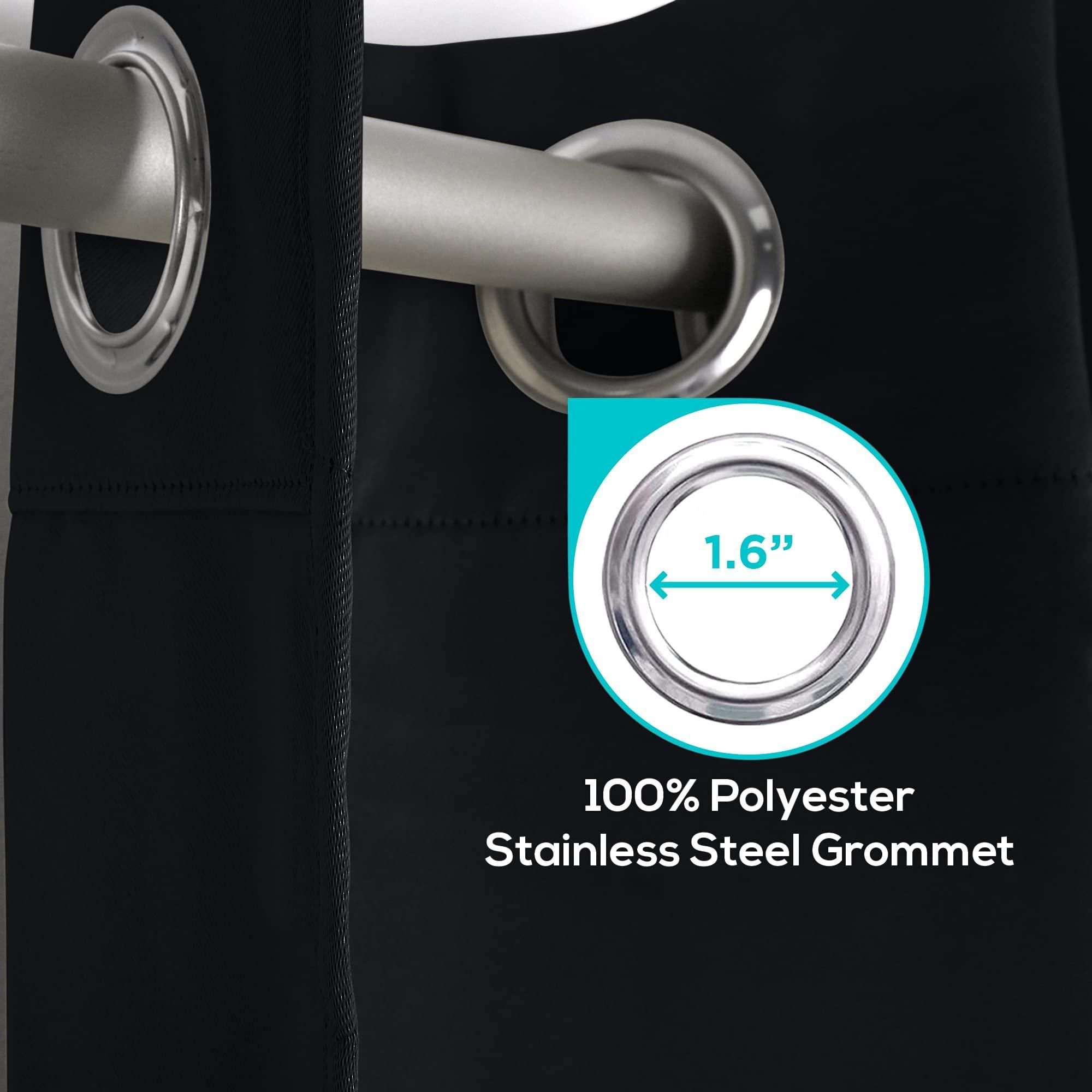 1.what's in the package? a set of 2 black blackout curtain panels, each panel measures 52 inches the width and 84 inches the length. each curtain panel includes 6 silver metal grommet rings, each grommet inner diameter is 1.6 inch, which is compatible with most rods, and easy slides to install.