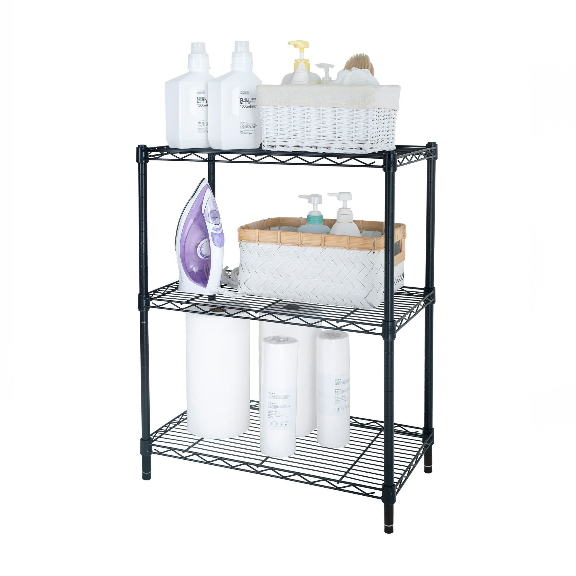 Hyper Tough 3 Tier Multi-Purpose Wire Shelving Rack in black color for adult is an easy assembly item with no tools required. It is an easy and versatile storage solution for your kitchen, laundry room, garage , office etc. Its metal shelves are adjustable in 1 inch increments. Adjustable foot levelers for uneven floors. Weight capacity per each shelf is 250 lbs when evenly distributed. NSF certified for dry storage applications. Perfect storage unit for your home.