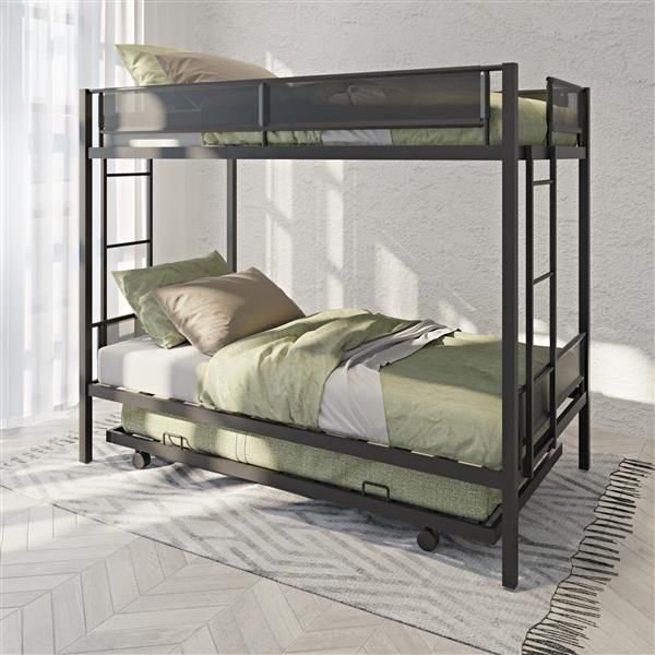 Twin over twin bunk bed with Trundle, Wood Slat and Textilene GuardrailEnhance comfort and space with our Metal Twin over Twin Bunk Bed with Trundle. Crafted for lasting durability and safety, the robust metal frame ensures stability. The noiseless wood slats, complemented by a center supporting beam, provide secure mattress support and longevity. Safeguard your child with full-length Textilene guardrails, promising gentle protection and peaceful sleep. Experience the convenience of the hidden trundle under the lower bunk, offering extra sleep space for guests or youngsters. Embrace modern design and optimize space effortlessly. Make bedtime an enjoyable experience while seamlessly integrating style with our contemporary bunk bedBreathable & Comfortable Textilene Mesh GuardrailOffering a soft and comfortable touch, the Textilene Guradrail provides a protective barrier for the top bunk gently and creates a cozy sleeping environment while keeping your child securely in place.Noise-Free Wood Slats with Strong Supporting BeamThe combination of wood slats and supporting beam offers exceptional mattress support and prevents sagging and noise during sleeping.Trundle for Extra Sleeping SpaceProviding versatile space solutions, the hidden trundle maximizes sleeping options without compromising floor space. It's perfect for sleepovers or family visits.Weight & DimensionsOverall Product Dimension77.95"(L) x 41.34"(W) x 65.35"(H)Detail Product DimensionPlease refer to the size imageNumber of Package1Package Dimension78.74" (L) x 14.96" ( W) x 8.27" (H)Overall Product Weight114.60 LBSPackage Weight123.41 LBSWeight CapacityUpper bed: 400 LBS; Bottom bed: 400 LBS; Trundle: 250 LBSRecommended Mattress Thickness6" - 8"SpecificationsProduct TypeBunk BedSizeTwin-Over-TwinColorBlackMaterialSTEELBox Spring RequiredNoNumber of SlatsTop bed: 14 (Wood Slat); Bottom bed: 14 (Wood Slat); Trundle: 19 (Metal Slat)Assembly RequiredYesCountry of OriginVietnamNoteManual measurement has been used, there may be some reasonable error. All the pictures are taken by actual samples, slight chromatic aberration may occur due to lighting or display.Solid Construction: Crafted from robust metal, ensuring durability and stability. Wood slats prevent mattress sliding and extend mattress lifespan.Guaranteed Safety: Full-length guard rails on top bunk provide extra security for your child. Certified by Children's Product Certificate (CPC) tests for added protection.Cozy Touch: Guard rails wrapped in breathable Textilene fiber offer comfort and a soft touch for peaceful sleep.Noise Reduced: Solid wood slats eliminate typical metal bed noises, ensuring quiet and restful sleep.Space Saving: Stylish design with built-in ladders and trundle under the lower bunk maximizes space.Fast Assembly: Clear instructions and provided tools ensure quick and hassle-free assembly.Assemble Required.Mattresses are not included.