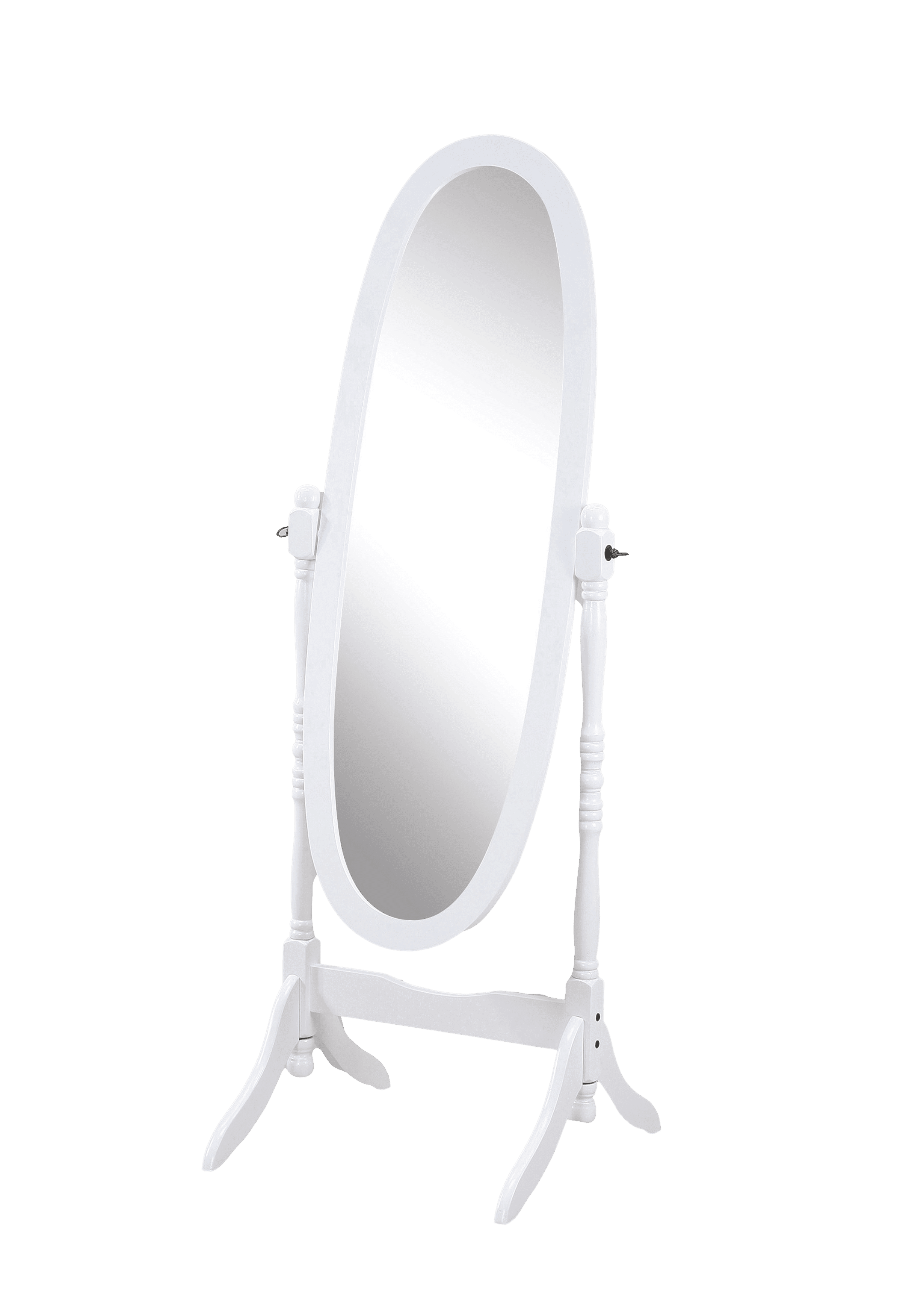 Traditional Style Wood Cheval Floor Mirror in White finishBeautiful cheval style mirror for traditional decor; tilts for full-body reflection;Elongated oval glass mirror with wood frame and stand; finished in warm heirloom White finish;Freestanding design swings mirror between stylish turned posts and curved bracketed feet; stretcher for stability between legs;Some assembly required, Instruction & hardware in the box.Item SKU: 3488WH